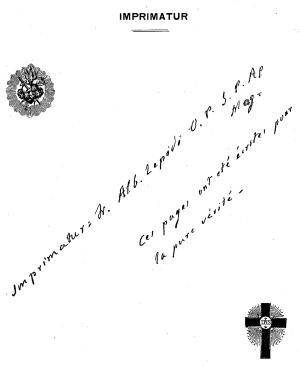 - Brochure de 1922 avec l’imprimatur supplémentaire du R. P. A. Lepidi, maître du sacré palais et assistant perpétuel de la congrégation de l’Index.
