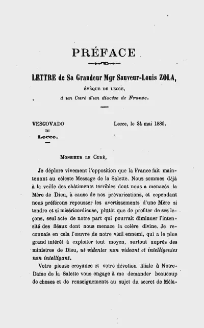 LETTRE de Sa Grandeur Mgr Sauveur-Louis ZOLA, ÉVÊQUE DE LECCE, a un Curé d’un diocèse de France. VESGOVADO Lecce, le 24 mai 1880.