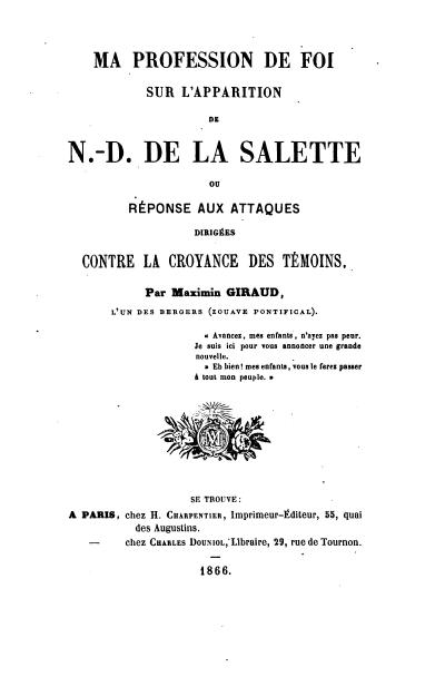 Maximin a écrit un livre Ma profession de foi sur l’apparition de N.-D. de la Salette ou réponse aux attaques dirigées contre la croyance des témoins dont vous pouvez ici trouver le contenu: